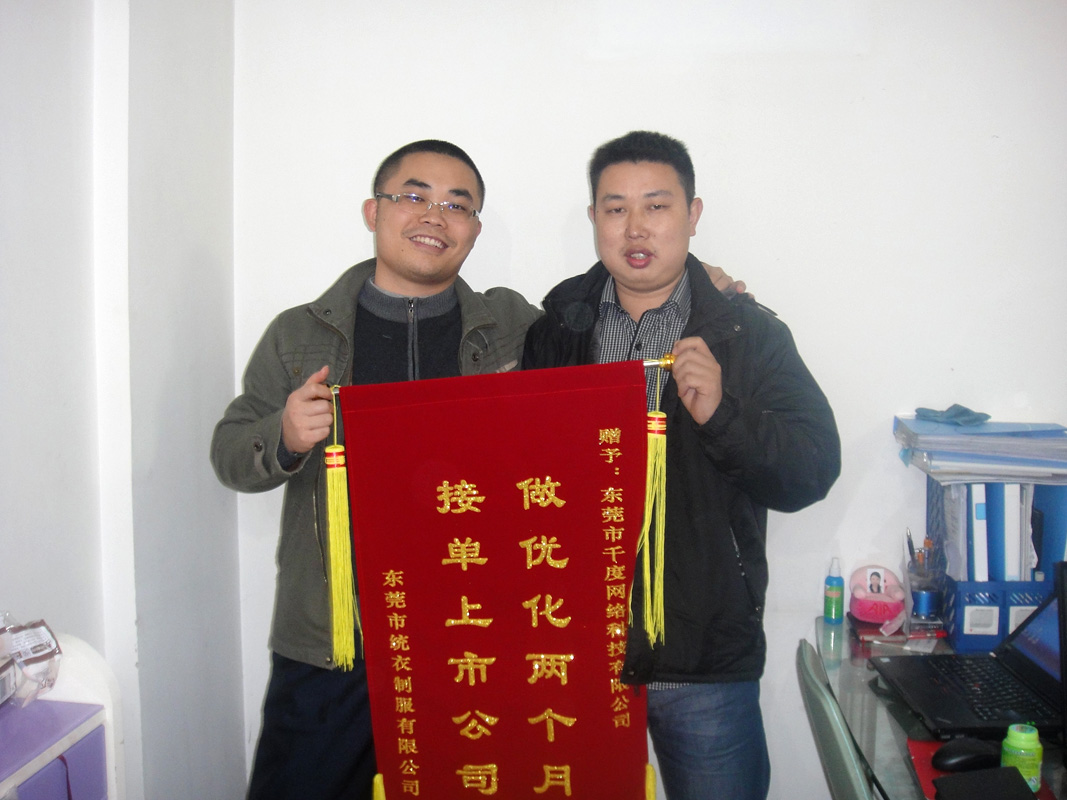 讓我感到非常意外的是,網(wǎng)站三天就搞好了,優(yōu)化也一周就有詞“車間工作服”排到百度等搜索引擎首頁了,他們的速度真是太快了。不到一個(gè)月,連工作服定做,定做廠房這些非常熱門的關(guān)鍵詞,都排到了首頁。真正實(shí)現(xiàn)了幾十個(gè)關(guān)鍵詞排到各大搜索引擎首頁的目標(biāo)。緊接著,QQ詢盤,電話咨詢,郵件溝通的越來越多。合作不到兩個(gè)月,我們就順利拿下了東莞萬江一個(gè)上市公司的訂單。現(xiàn)在,我們每個(gè)月都陸陸續(xù)續(xù)地接到不少訂單,可以說商機(jī)無限。千度科技客服部每周都幫我們維護(hù)更新網(wǎng)站,后面還幫我們培訓(xùn)了SEO基礎(chǔ)常識(shí),網(wǎng)絡(luò)營銷客服溝通技巧,電話行銷等一系列的課程,這些給我們的幫助都非常大。到公司后來決定在東莞南城成立銷售中心,成立贛縣生產(chǎn)基地和于都生產(chǎn)基地,這些公司的跨越式發(fā)展跟千度科技的幫助也是分不開的。非常感謝周總,感謝千度科技!