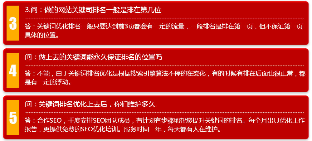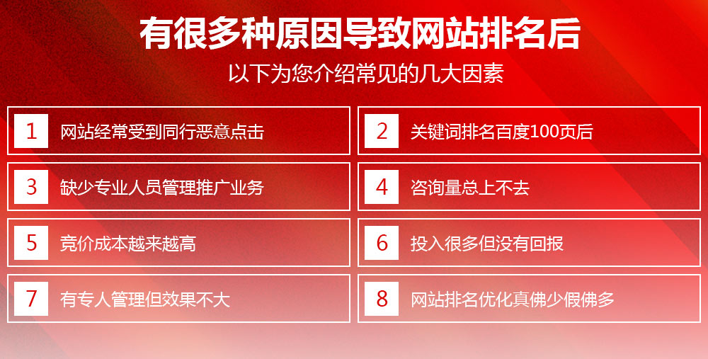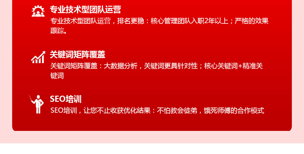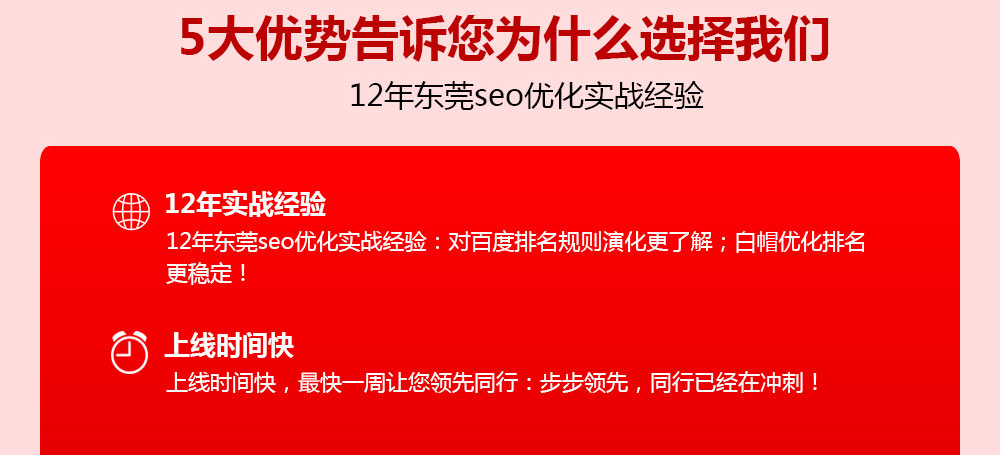 上線時間快,最快一周讓您排首頁 關鍵詞不限,幾十個關鍵詞上線 白帽優化手法,專業團隊運作更穩定 免費優化培訓,培訓企業御用推廣專員 15年優化經驗,我們更了解排名規則變化