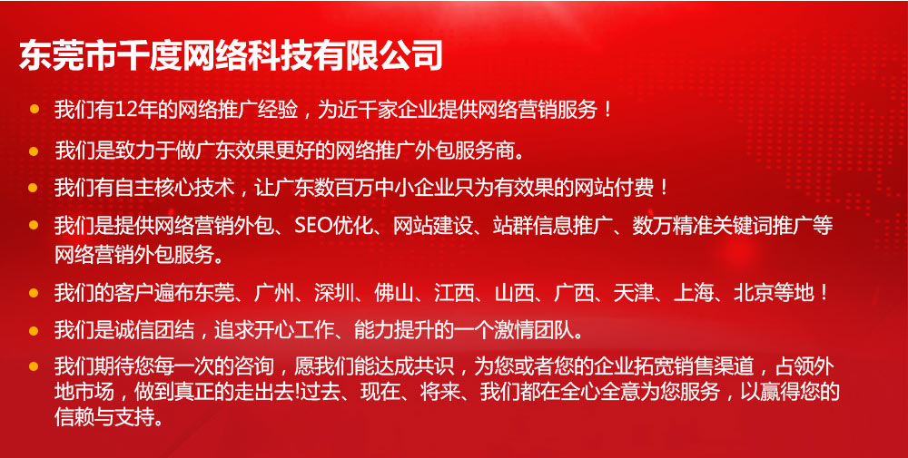 我們有15年的網絡推廣經驗,為1027家企業提供網絡營銷服務! 我們是致力于做廣東效果更好的網絡推廣外包服務商。 我們有自主核心技術,讓廣東數百萬中小企業只為有效果的網站付費! 我們提供短視頻矩陣關鍵詞優化、短視頻運營、SEO優化、網站建設等網絡營銷外包服務。 我們的客戶遍布東莞、廣州、深圳、佛山、江西、山西、廣西……更多+
